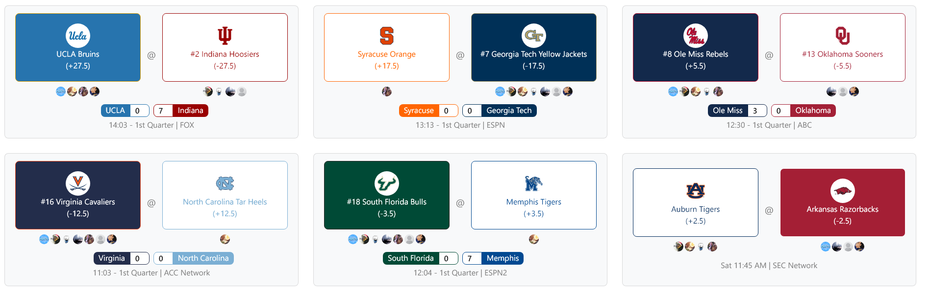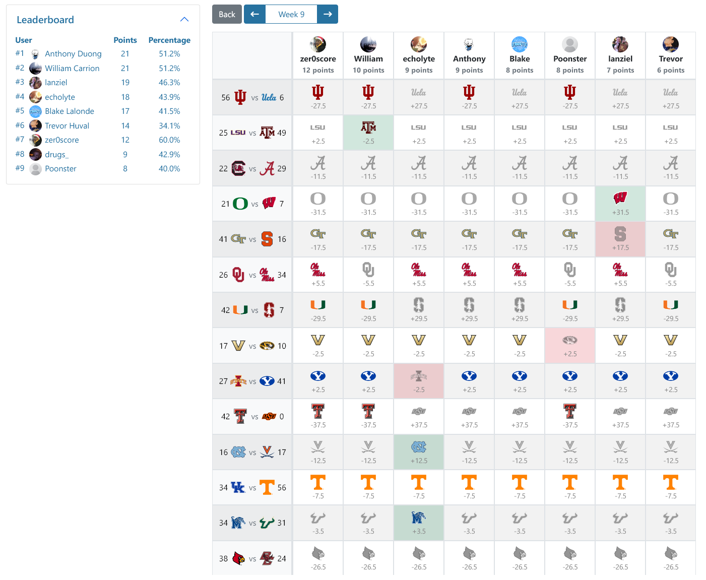 A college football matchup selection competition between users, picking matchups based on betting spreads.